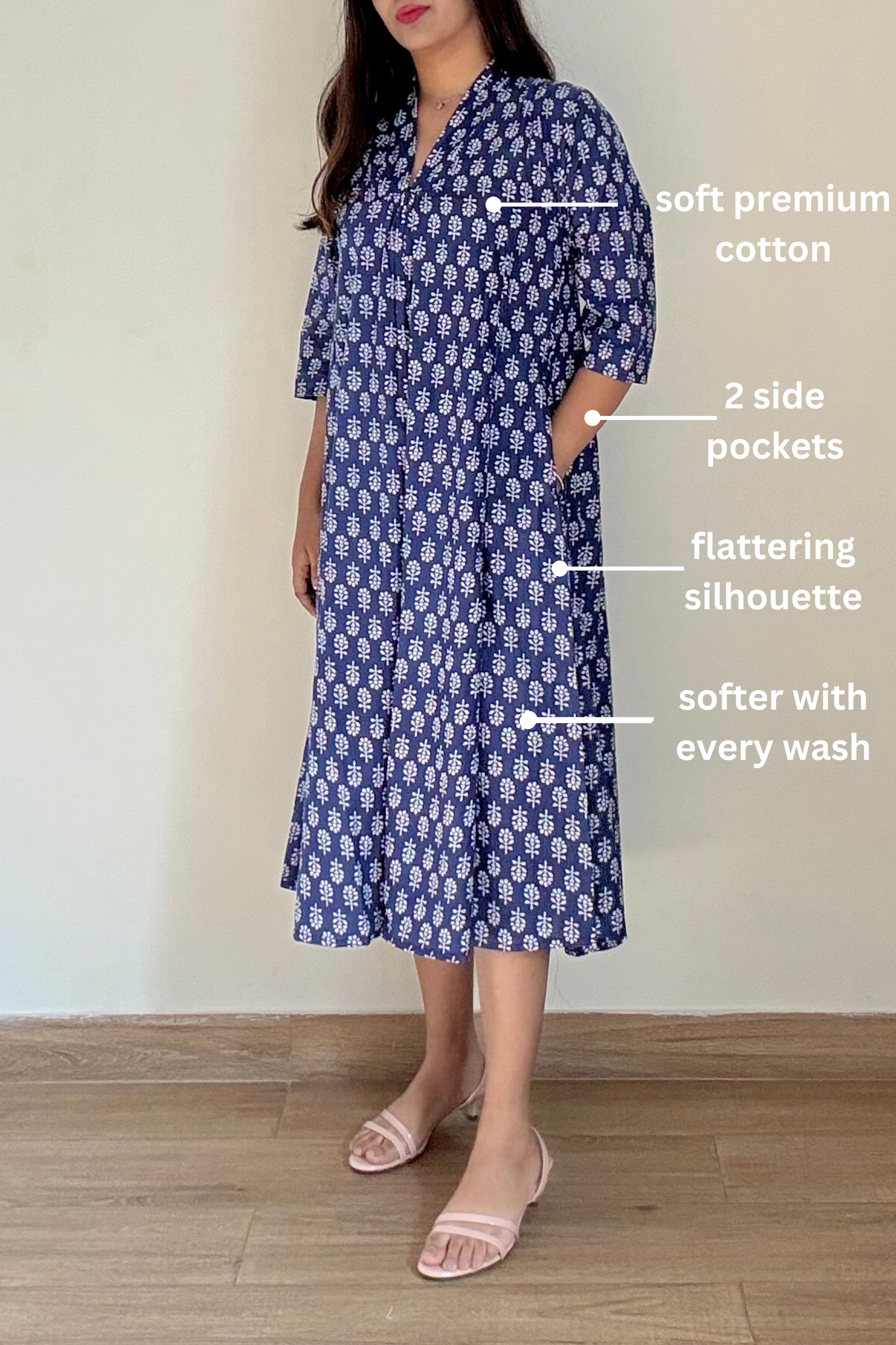 Introducing our versatile cotton indigo kurta dress with floral print details, perfect for work, leisure, or vacation. The flare dress offers comfort and style all day.