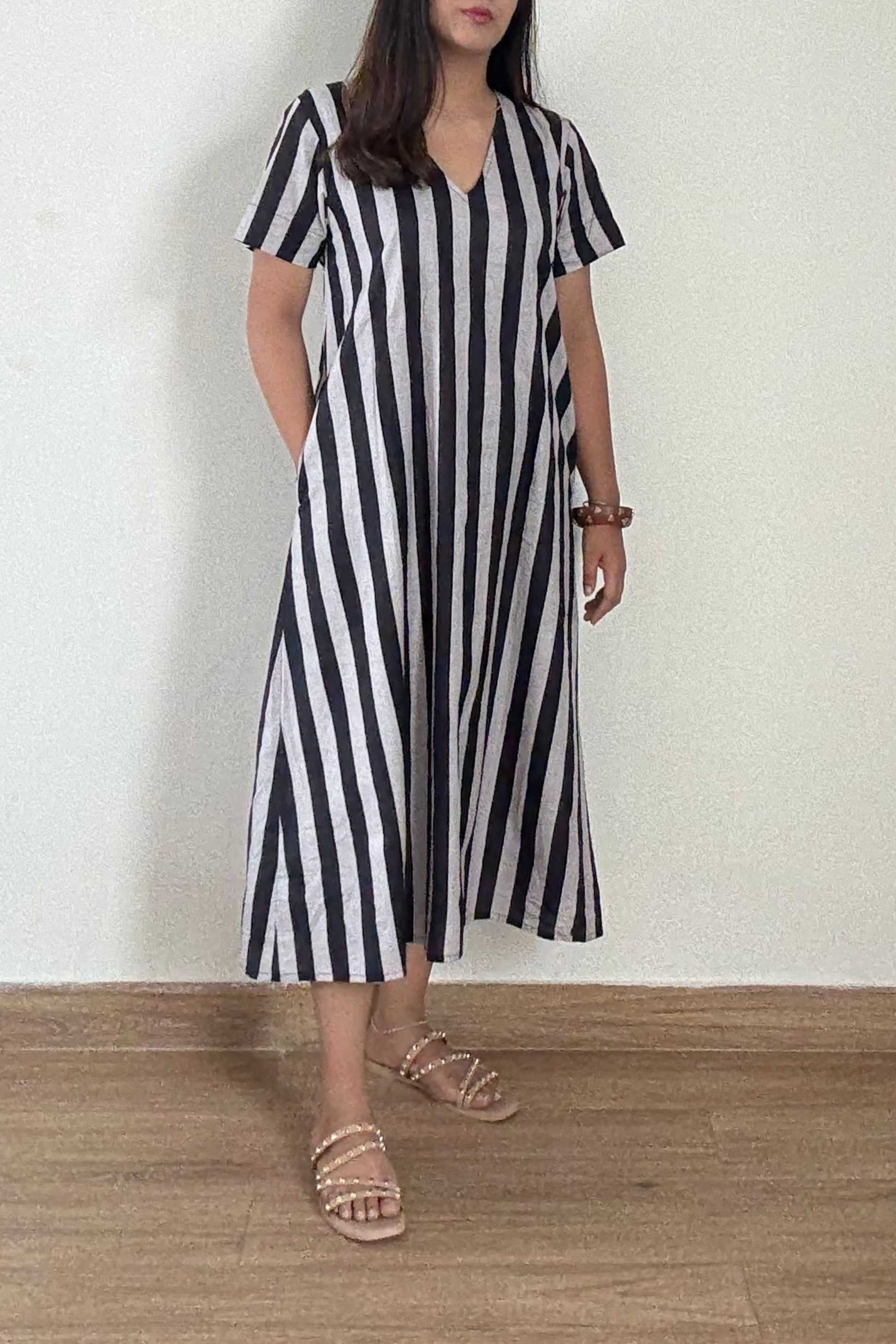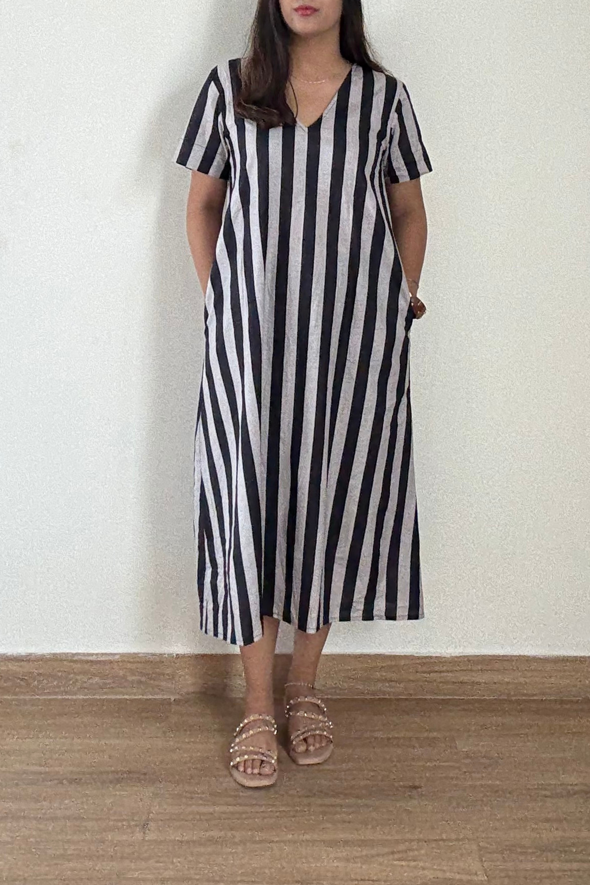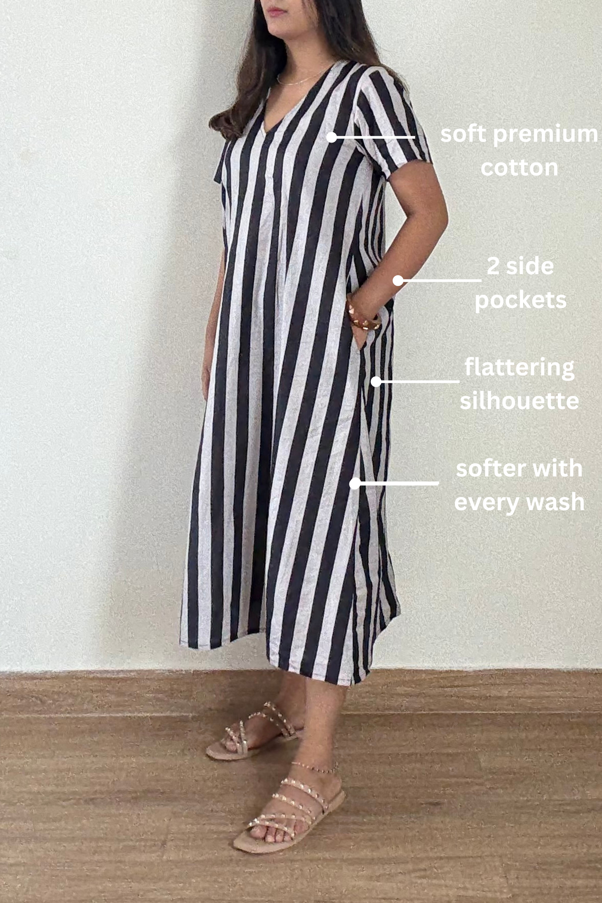 Introducing our versatile long kurta dress with block-printed stripes, perfect for casual workwear, leisure, and vacation.