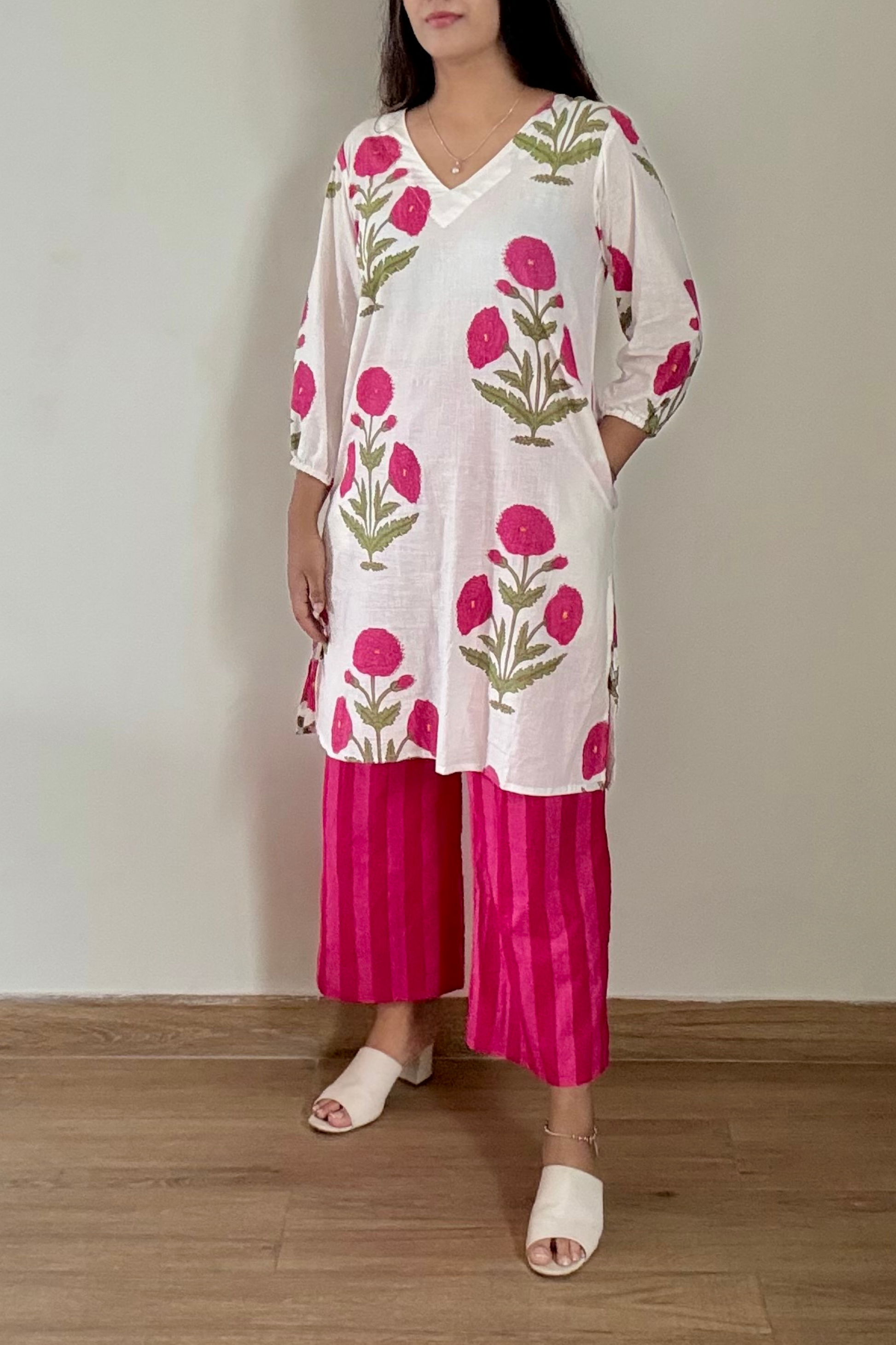 Introducing our versatile Cotton Coord Set with floral and stripe print. Ideal for work and out of office errands, it offers comfort and style. Features V-neckline, 4 side pockets and elasticated waistband and sleeve hems, this kurta set is both practical and chic. The set contains 2 pieces- Kurta and Pants. The set does not require any slip or lining.