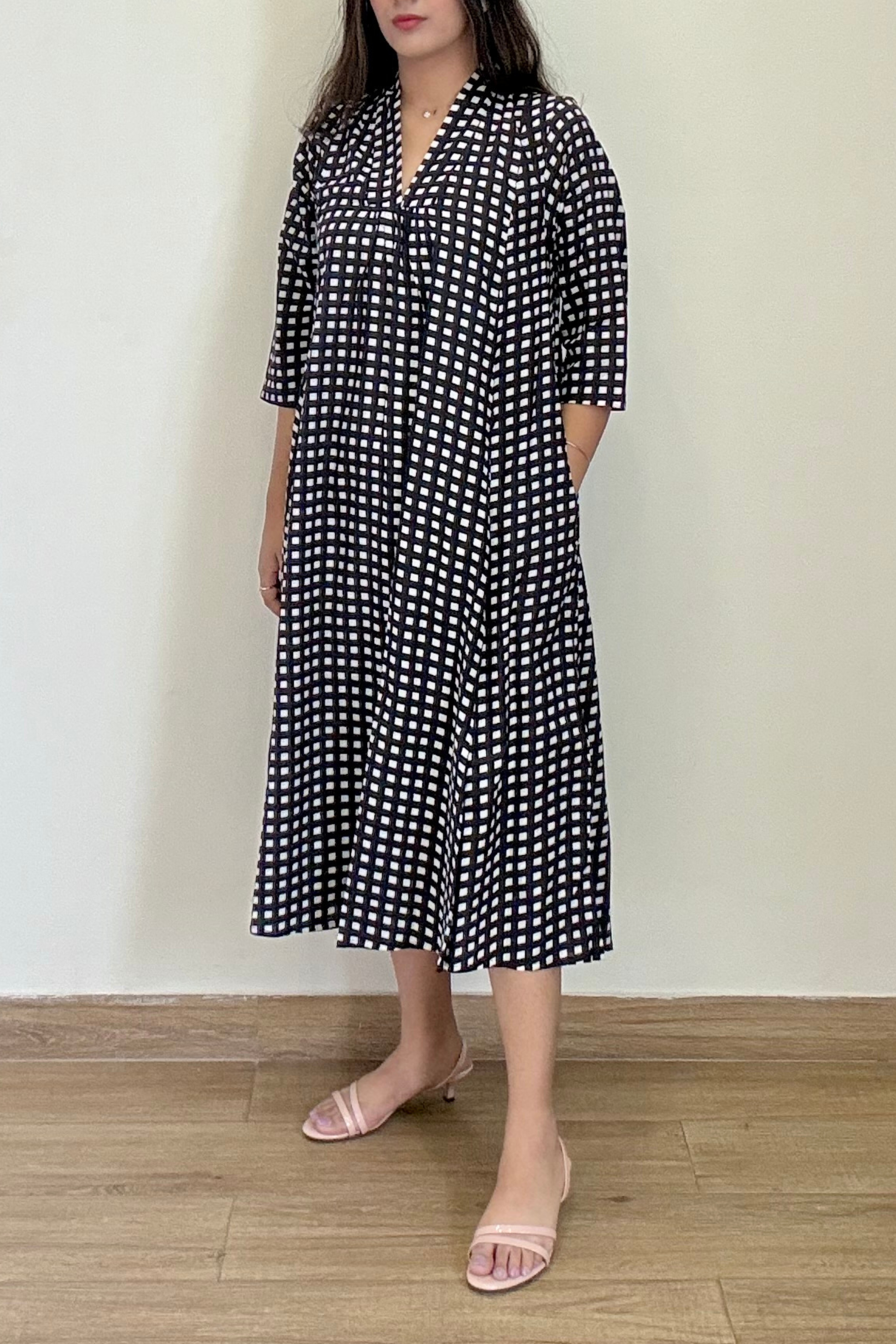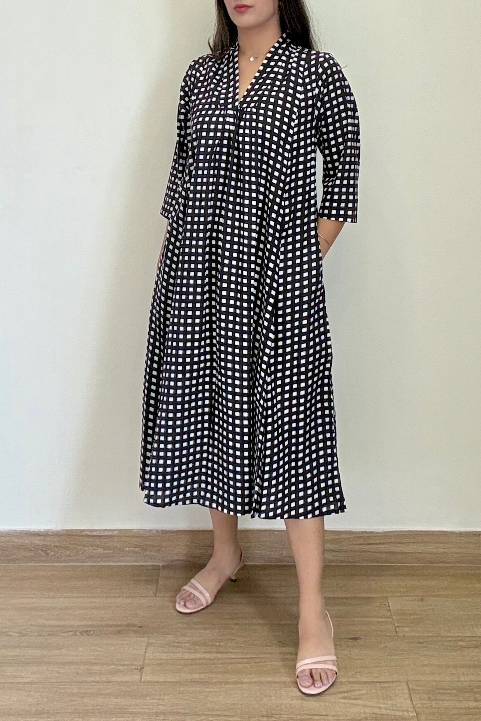 Introducing our versatile cotton kurta dress with gingham print, perfect for work, leisure, or vacation. The flare dress offers comfort and style all day.