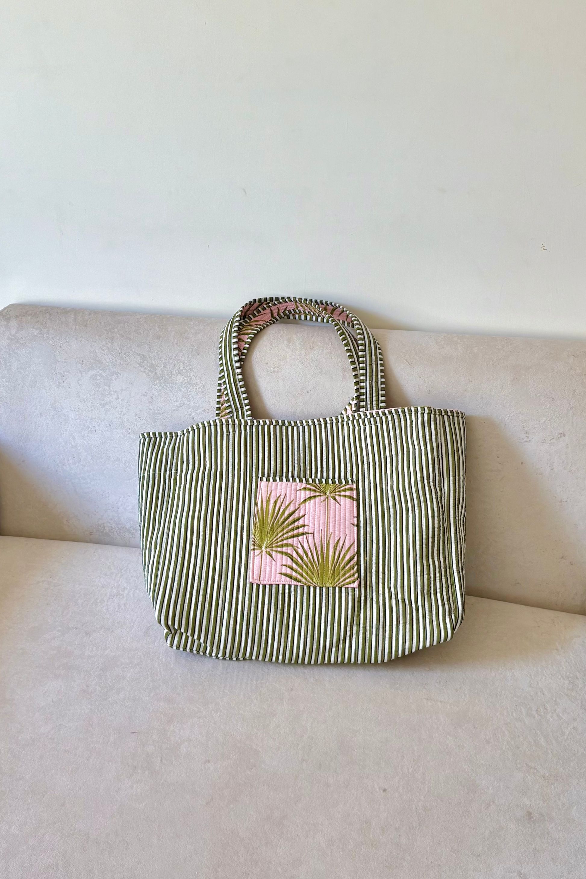 Introducing our versatile quilted travel tote bag with printed palm leaf and stripes, perfect for work, leisure, and vacation.